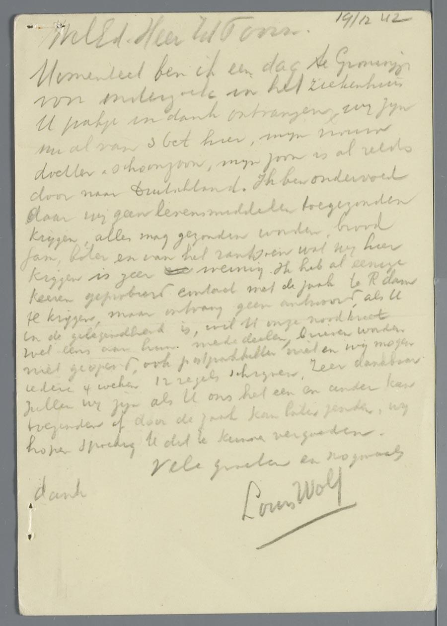 Briefkaart van Louis Wolf die in Westerbork zit met zijn vrouw, dochter en schoonzoon, maar voor onderzoek in het ziekenhuis in Groningen is, 1942