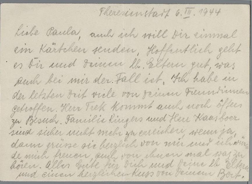 Briefkaart uit Theresienstadt van Bert Löwenthal aan zijn buurmeisje Paula Feiwel in Amsterdam, maart 1944