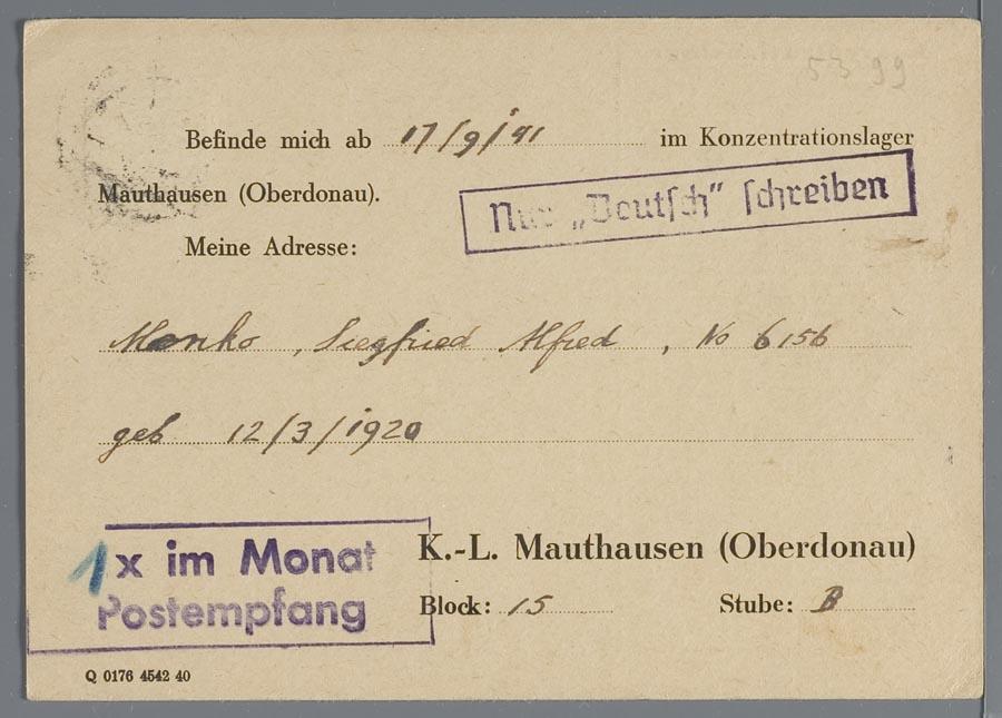 Briefkaart van Siegfried Alfred Menko uit Mauthausen, aan zijn familie te Enschede, september - oktober 1941