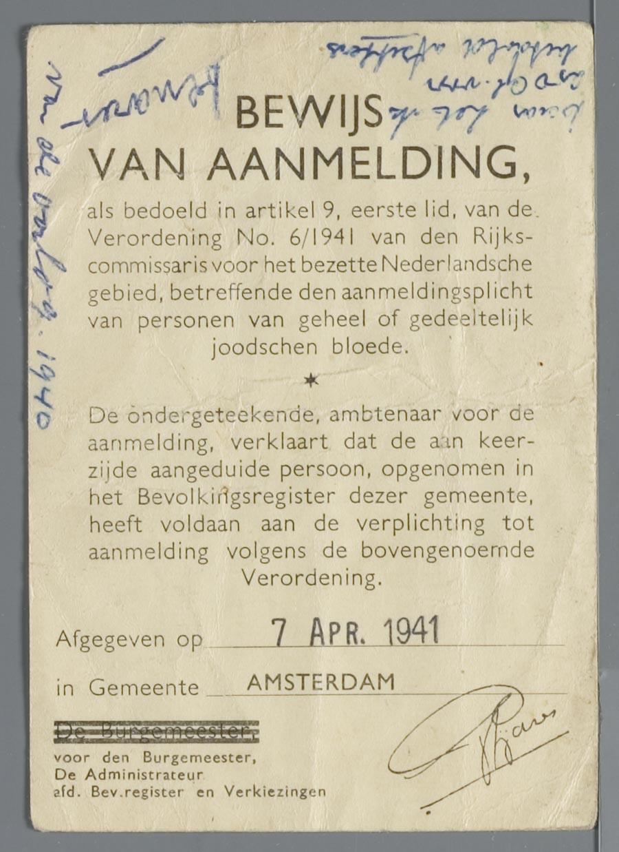 Handgeschreven op dit bewijs: 'daar heb ik 250 gl. voor betaald. Afzetters.' Op dit bewijs is Irene Kat de oorlog doorgekomen. De gegevens op dit bewijs zijn onjuist: geboortemaand, adres en aantal joodse grootouders klopt niet. Irene Kat had vier joodse grootouders.