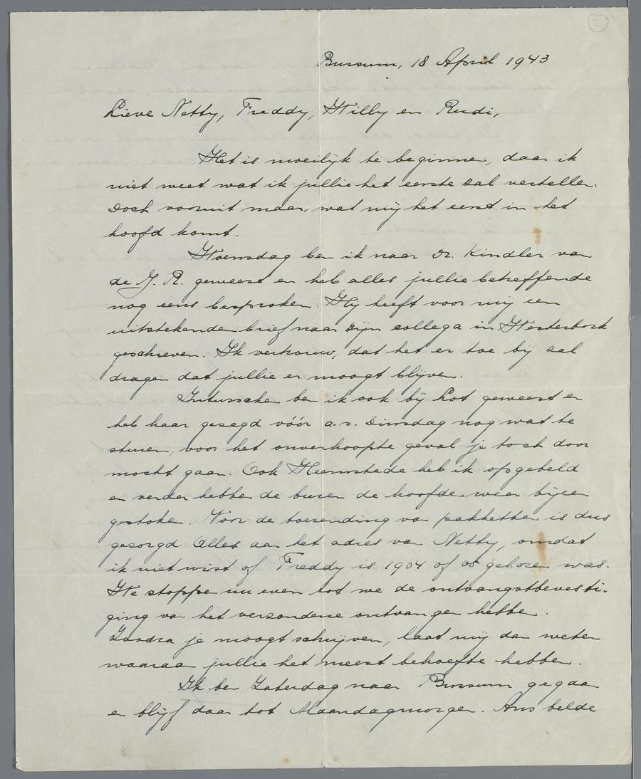 Brief van Marie Verschuur aan familie Abas-Swaab in Westerbork, 1943