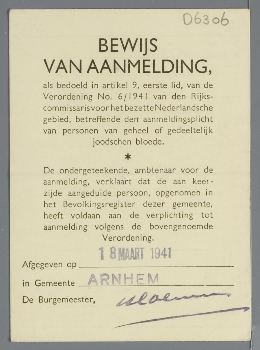 Aanmeldingsbewijs voor personen van geheel of gedeeltelijk joodsche bloede t.n.v. Maurits Emile v. Kreveld, 1941