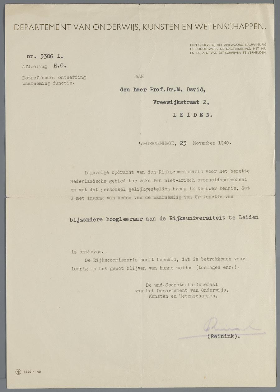 Brief aan professor dr. M. David betreffende de ontheffing uit zijn functie van bijzonder hoogleraar aan de universiteit Leiden, 1940