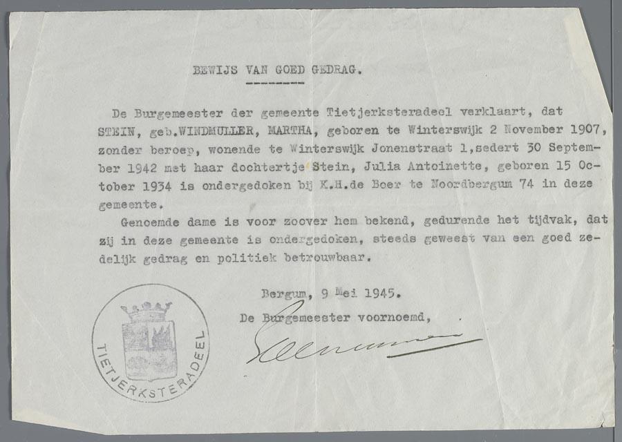 Bewijs van goed gedrag voor Martha Stein-Windmuller van gemeente Tietjerksteradeel, 1945