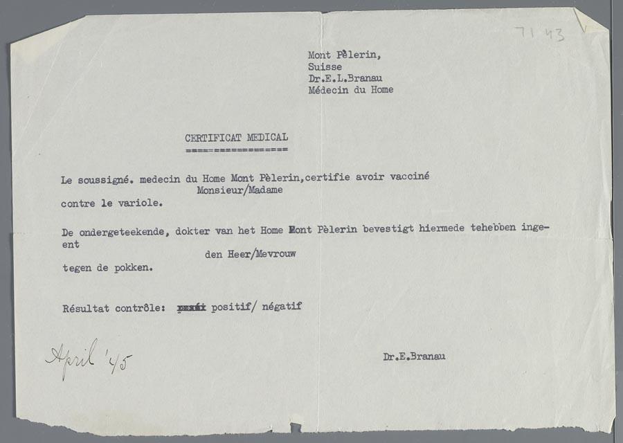 Doktersverklaring op naam van Henriette van Vriesland-Leeuwin met betrekking tot inenting tegen pokken, d.d. april 1945