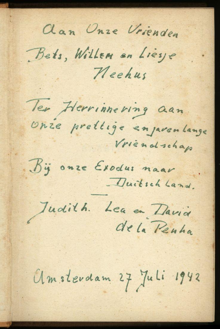 'Babbit', roman van Sinclair Lewis, uitgegeven in 1931, met voorin een handgeschreven opdracht van de familie de la Penha aan de familie Neehus geschreven vlak voor hun deportatie, 27 juli 1942