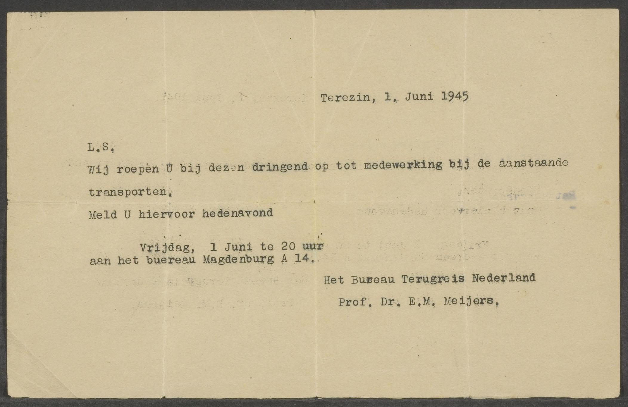 Circulaire geadresseerd aan R. Blik van Prof. Dr. E.M. Meijers van het Bureau Terugreis Nederland in Theresienstadt met betrekking tot medewerking aan de transporten, 1945