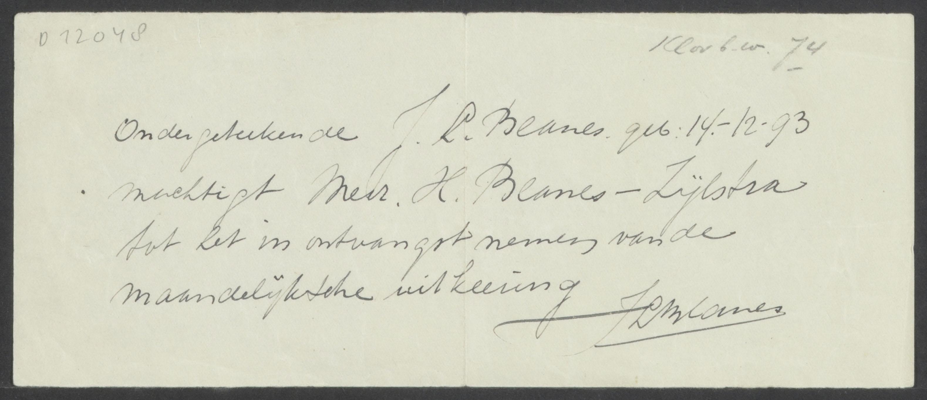 Machtiging tot het in ontvangst nemen van de maandelijkse uitkering, afgegeven door Louis Blanes aan zijn schoonzuster Henny Blanes-Zijlstra, circa 1942
