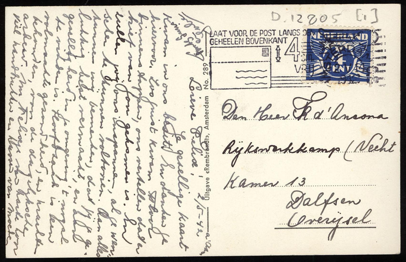 Brieven (2) en briefkaarten (3) van Milca d'Ancona-Lobatto, haar zus Sara Brandon-Lobatto en Julia Franken vanuit Amsterdam en Westerbork aan hun resp. zoon, neef en halfbroer Rehuel (Felix) d'Ancona (1902-1978), 1942-1943