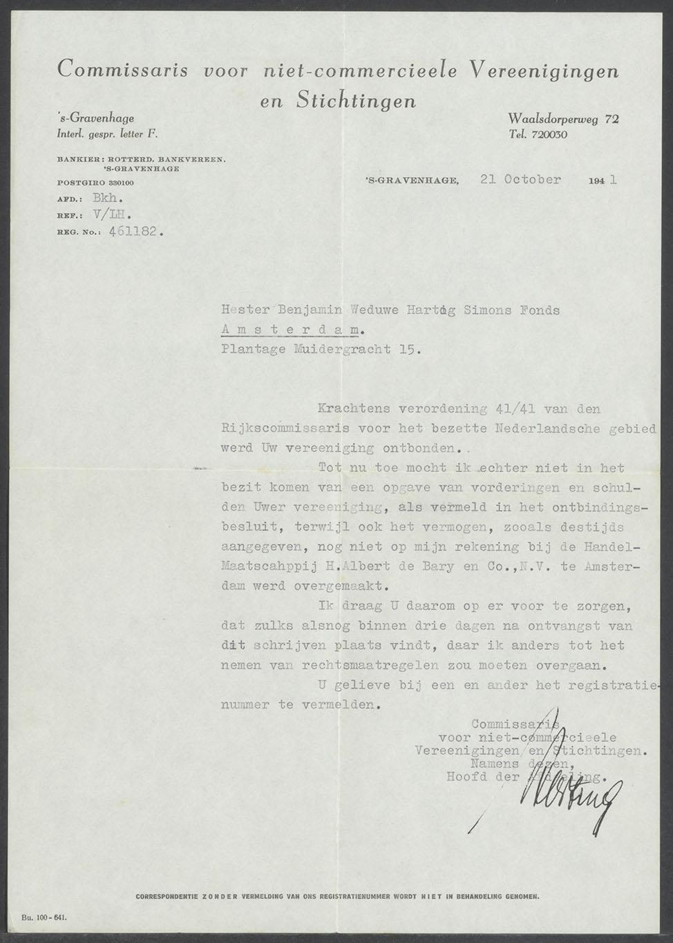 Brief van de Commissaris voor niet-commerciële Verenigingen en Stichtingen aan het 'Hester Benjamin Weduwe Hartog Simons Fonds' met de mededeling dat het fonds is ontbonden, 1941