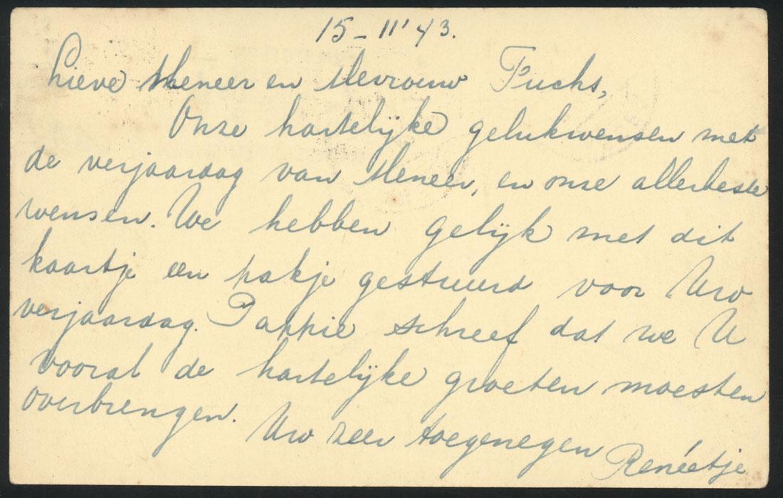 Briefkaart van Renéetje Cohen aan het echtpaar Fuchs-Oppenheimer in Westerbork die als onbestelbaar aan haar werd geretourneerd, november 1943