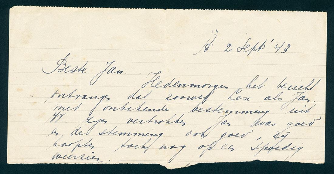 Briefje aan ene Jan over 'Jan en Lex' (= Mariane Houtkruijer-Levie en haar man Alexander Houtkruijer met onbekende bestemming zijn vertrokken, 1943