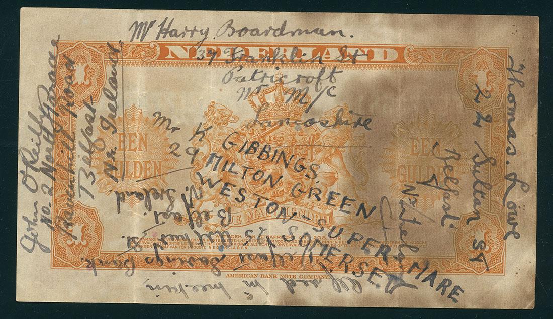 Bankbiljet van een gulden met daarop geschreven de namen van vijf parachutisten van de 1st British Airborne Divison, 1944