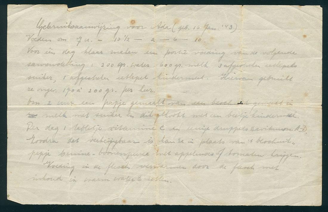 handgeschreven notitie voor het voeden van Ada Jacobs, geboren 16 januari 1943, waarschijnlijk door haar moeder geschreven voor de onderduikouders