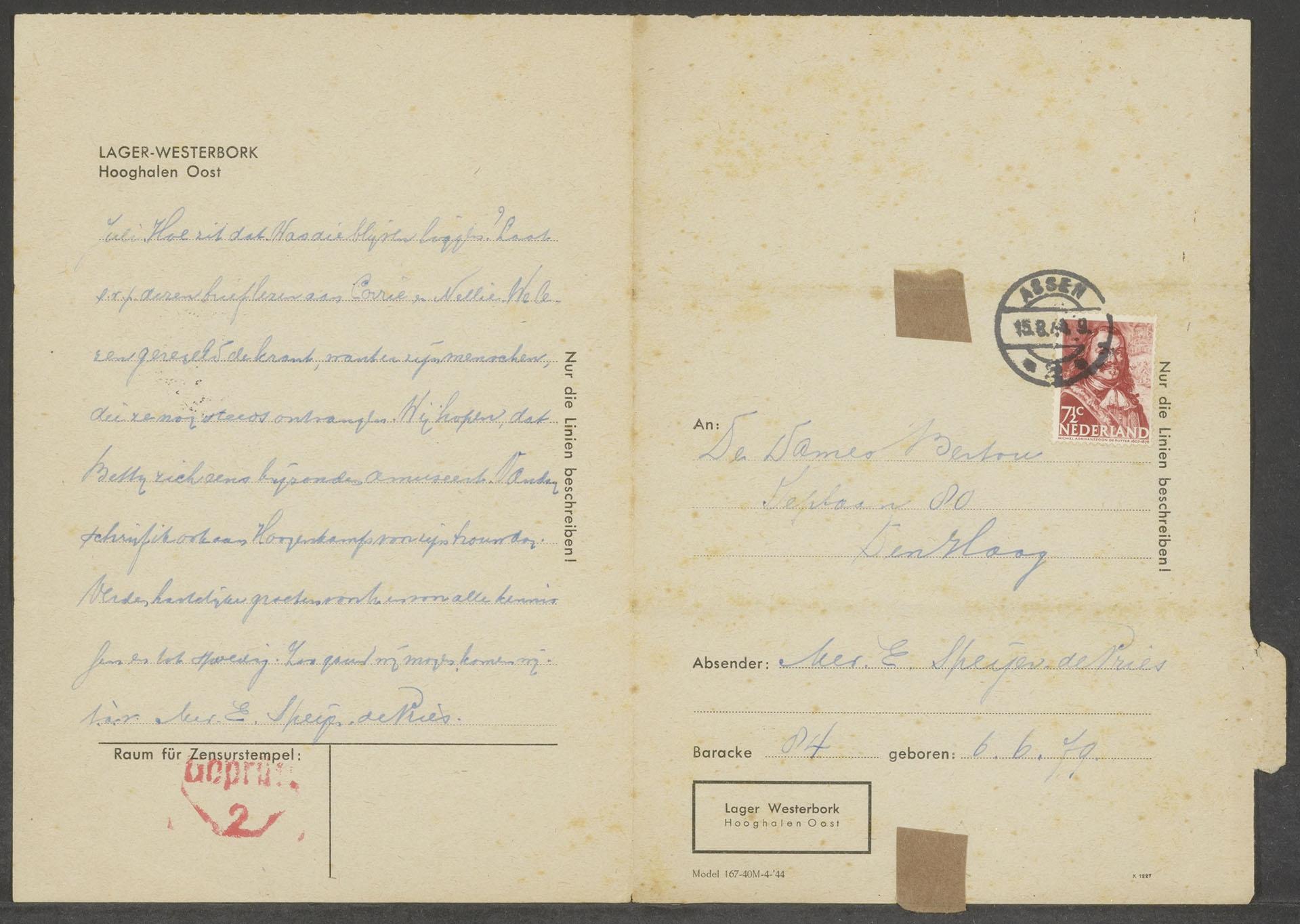 Dr. E.A.M. Speijer verbleef van 19 december 1942 tot 29 september 1943 in het Joods Tehuis te Barneveld. Op 29 september 1943 werd hij van Barneveld naar Westerbork overgebracht. Daar bleef hij tot 4 september 1944. Deze brief is gestempeld met Assen 2, - 9 uur, censuurstempel: "Geprüft 1" in rood. Elisabeth Speijer-de Vries bedankt de dames voor de heerlijke appels. Ook schrijft ze dat "alles wat geen levensmiddelen bevat, vrij gestuurd mag worden zonder pakketzegel...".