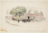 Uit een ruimte in de stadsomwalling wordt door een openstaande deur een kist of doos naar buiten gedragen. Een wagen vol met dezelfde kisten of dozen, ervoor een paard, staat voor de deur te wachten. Een groepje mensen, op de rug gezien, staat erbij te kijken. Vermoedelijk gaat het hier om kartonnen dozen met as, die naar het 'Columbarium' gebracht worden
