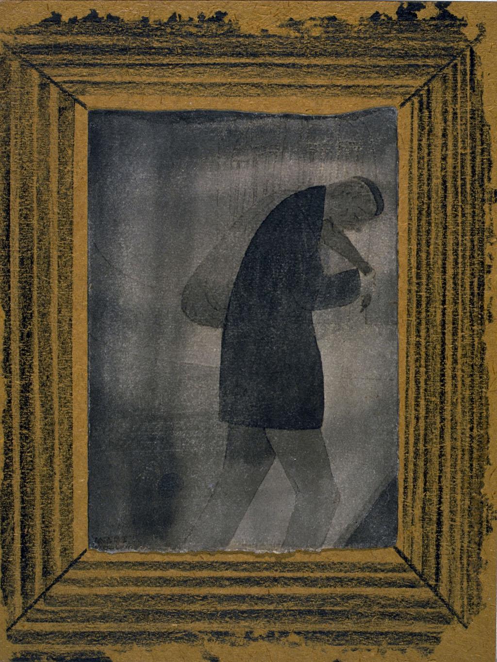 Man, van opzij gezien, naar rechts gewend, tot onder kniehoogte afgebeeld. De man loopt in gebogen houding, met een plunjezak op de rug. Hij draagt een half lange jas en een petje op het hoofd