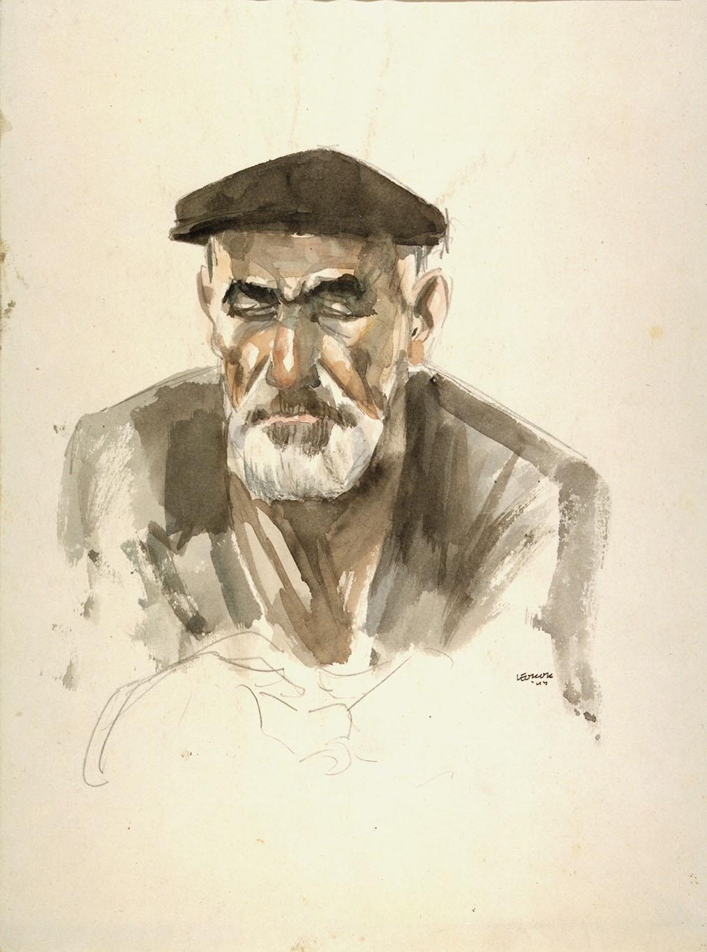 Man, borststuk en face, met korte grijze baard en een alpinopet met zijn ogen dicht (blind).
