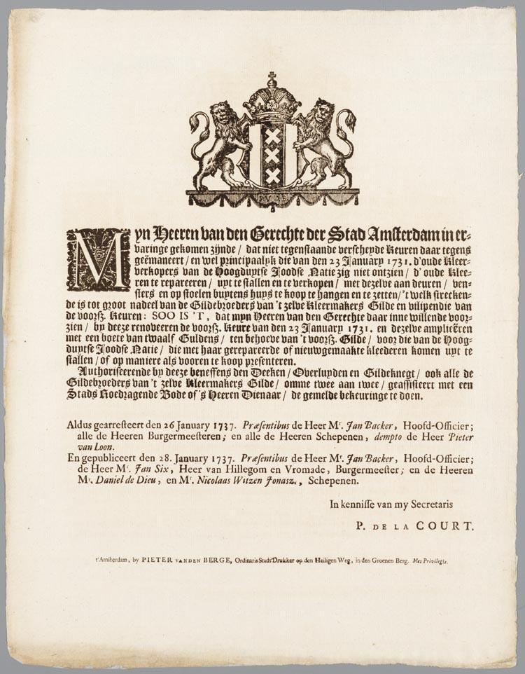 Afkondiging der stad Amsterdam op last van de gildebroeders van het kleermakersgilde inhoudende een verbod voor joden om oude kleren te verkopen, uit te stallen, te repareren of te venten.