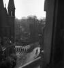 Colonne Duitse militairen marcherend door de Vondelstraat, gezien vanuit een zolderraam terwijl ze richting de links nog zichtbare Vondelkerk lopen.