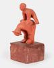 Terracotta beeldje voorstellende een kind dat bokspringt over een gebogen staande man. Als sokkel dient een halve baksteen.