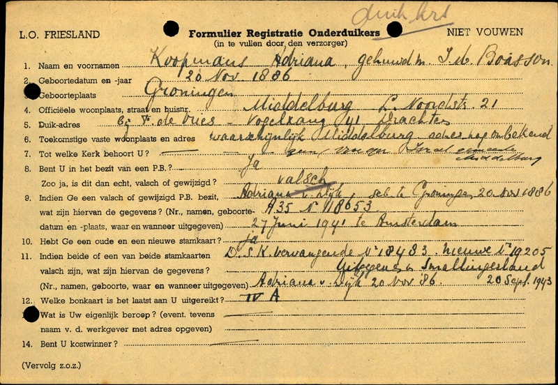 Duikadres: Vogelzang 41, Drachten - Oorspronkelijk adres: Lange Noordstraat 21, Middelburg - Reden onderduik: jodenvervolging - Overige opmerkingen: Bijzondere opmerkingen: Gehuwd met J. d. Boasson. - Vals PB: Naam is gewijzigd in Adriana van Dijk. Kaartnr. A35 118653. Uitgegeven 27 juni 1941 te Amsterdam. - Directe vordering aan de N.V. Comewo f650,-. Gedeelte v. geleverde en als onbruikbaar teruggestuurde persoonsbewijzen. - Kerk: geen (vroeger Israël. gemeente Middelburg)