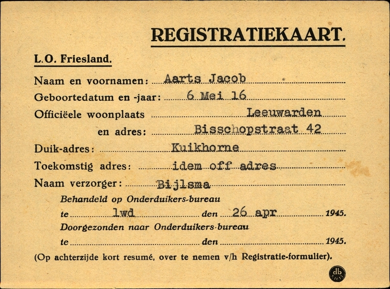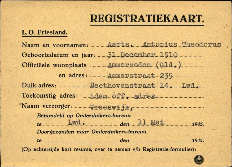 Duikadres: Beethovenstraat 14, Leeuwarden - Oorspronkelijk adres: Ammerstraat 235, Ammerzoden (Gld.) - Reden onderduik: arbeidsinzet - Overige opmerkingen: Achterkant beroep: slager