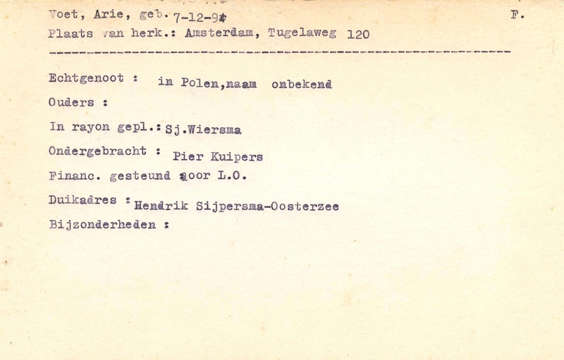 Duikadres: Oosterzee - Oorspronkelijk adres: Tugelaweg 120, Amsterdam - Overige opmerkingen: Bijzonderheden: Echtgenote in Polen,naam onbekend - - Financ.gesteund door L.O.