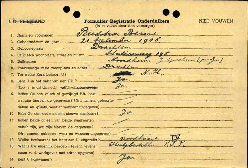 Duikadres: Noordhorn - Oorspronkelijk adres: Stationsweg 145, Drachten - Reden onderduik: arbeidsinzet - Overige opmerkingen: Bijzondere opmerkingen: In bezit van oude en nieuwe stamkaart, noodkaart IV, kostwinner, geen salaris wel ondersteuning tot 17 maart. Kan direct weer in oude werk beginnen