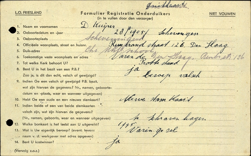 Duikadres: Chr. ULO school, Drachten - Oorspronkelijk adres: Rembrandtstraat 126, `s Gravenhage - Reden onderduik: arbeidsinzet - Overige opmerkingen: Bijzondere opmerkingen: Op het valse PB is het beroep gewijzigd.
