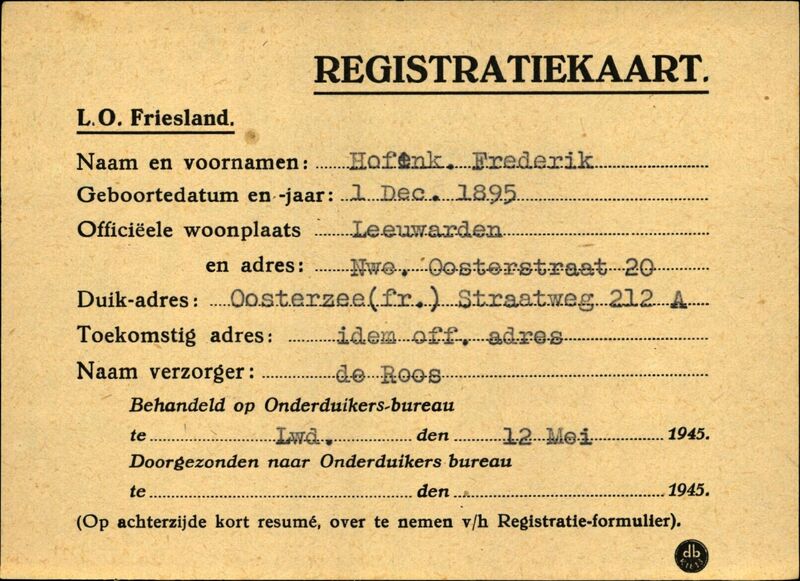 Duikadres: Straatweg 212 A, Oosterzee - Oorspronkelijk adres: Nieuwe Oosterstraat 20, Leeuwarden - Reden onderduik: illegaal werk - Overige opmerkingen: Achterkant bijzonderheden: geen stkrt. - Achterkant beroep: Koopman