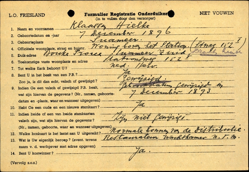 Duikadres: Zuid, Suameer - Oorspronkelijk adres: Stationsweg 152 I, Drachten - Reden onderduik: staking - Overige opmerkingen: Bijzondere opmerkingen: Opmerkingen: Zeer gaarne wil ik zo spoedig mogelijk weer in het bezit gesteld worden van een inboedel en inventaris restauratie, opdat ik zelf weer in mijn onderhoud kan voorzien.