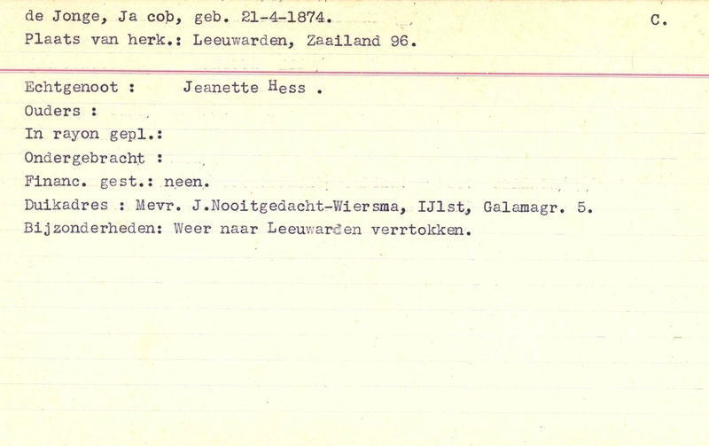 Onderduikinschrijving van Jacob de Jonge