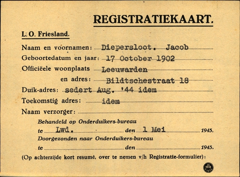 Duikadres: Bildtsestraat 18, Leeuwarden - Oorspronkelijk adres: Bildtsestraat 18, Leeuwarden - Reden onderduik: anderszins - Overige opmerkingen: Achterkant bijzonderheden: Ondergedoken wegens persoonlijk gevaar, waarschijnlijk gezocht voor gijzeling - 2 valsche P.B.'s. Geen stkrt. - Achterkant beroep: predikant
