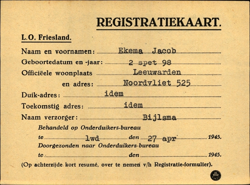 Duikadres: Noordvliet 525, Leeuwarden - Oorspronkelijk adres: Noordvliet 525, Leeuwarden - Reden onderduik: staking - Overige opmerkingen: Achterkant bijzonderheden: Spoorwegstaking. - Achterkant beroep: wegwerker - Achterkant naam werkgever: spoorwegen