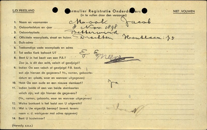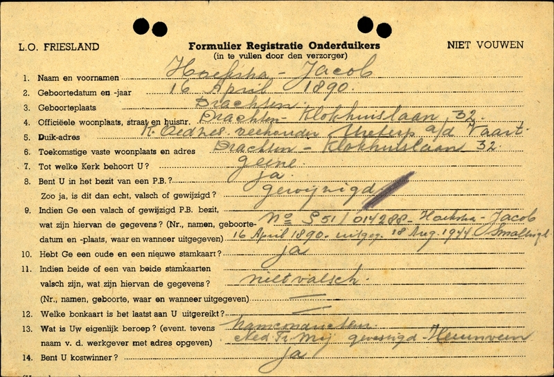 Duikadres: Ureterp a/d Vaart - Oorspronkelijk adres: Klokhuislaan 32, Drachten - Reden onderduik: anderszins - Overige opmerkingen: Bijzondere opmerkingen: Gedeeltelijk is de inboedel door den vijand weggenomen. P.B. no. S51 / 014288 uitgegeven 18 aug. 1944. Mij is verzocht den arbeid te staken. " Uit veiligheidsoverweging ben ik met vrouw en dochter ondergedoken.
