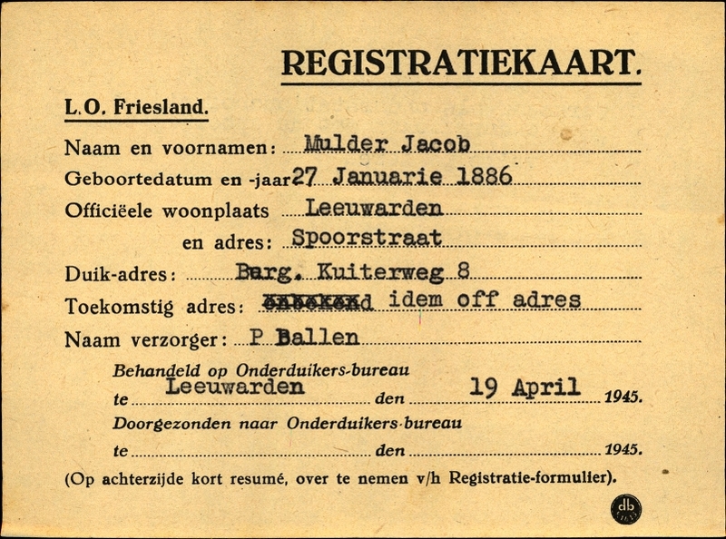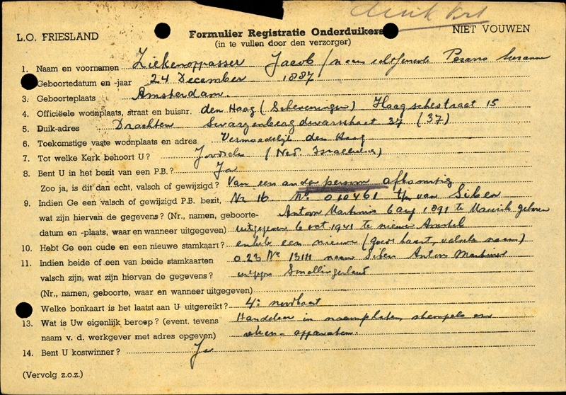 Onderduikinschrijving van Jacob Ziekenoppasser