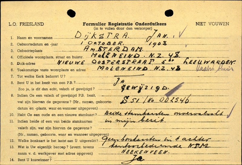 Duikadres: Nieuwe Oosterstraat 5 bv, Leeuwarden - Oorspronkelijk adres: Moleneind Noordzijde 48, Drachten - Reden onderduik: staking - Overige opmerkingen: Bijzondere opmerkingen: Bij officiële adres staat geen woonplaats, moet zijn: Drachten. Vijand heeft beslag gelegd op radiotoestel