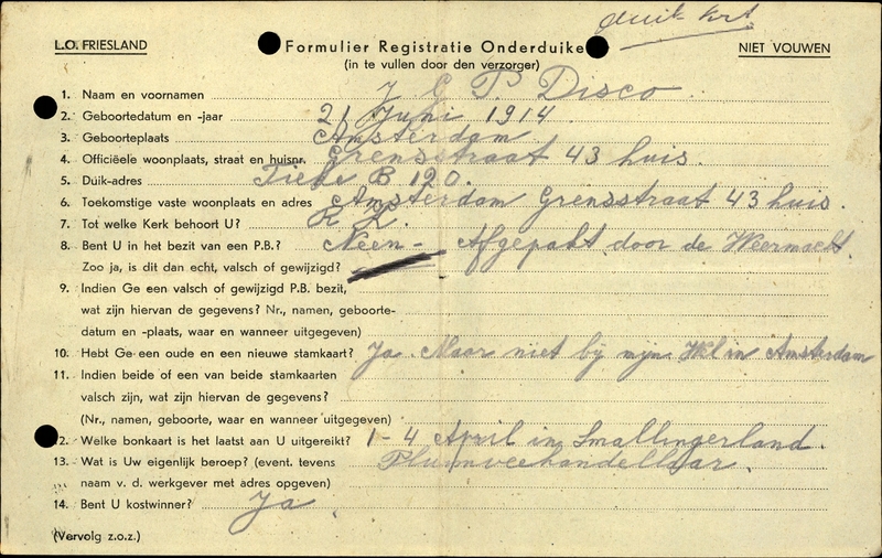 Duikadres: B 120, De Tike - Oorspronkelijk adres: Grensstraat 43 huis, Amsterdam - Reden onderduik: arbeidsinzet - Overige opmerkingen: Bijzondere opmerkingen: P.B. Afgepakt door de weermacht. - Weggevoerd naar Duitsland
