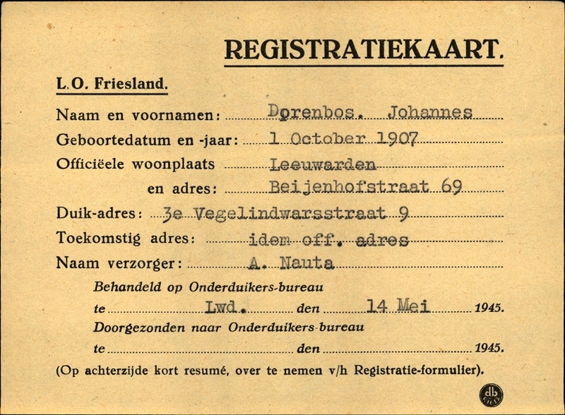Duikadres: 3e Vegelindwarsstraat 9, - Oorspronkelijk adres: Bijenhofstraat 69, Leeuwarden - Reden onderduik: krijgsgevangene - Overige opmerkingen: Achterkant beroep: timmerman