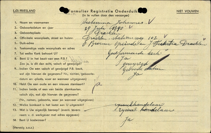 Duikadres: Opeinde - Oorspronkelijk adres: Stationsweg 102, Drachten - Reden onderduik: arbeidsinzet - Overige opmerkingen: Bijzondere opmerkingen: Tweede onderduikadres: - J. Tiekstra, Drachten