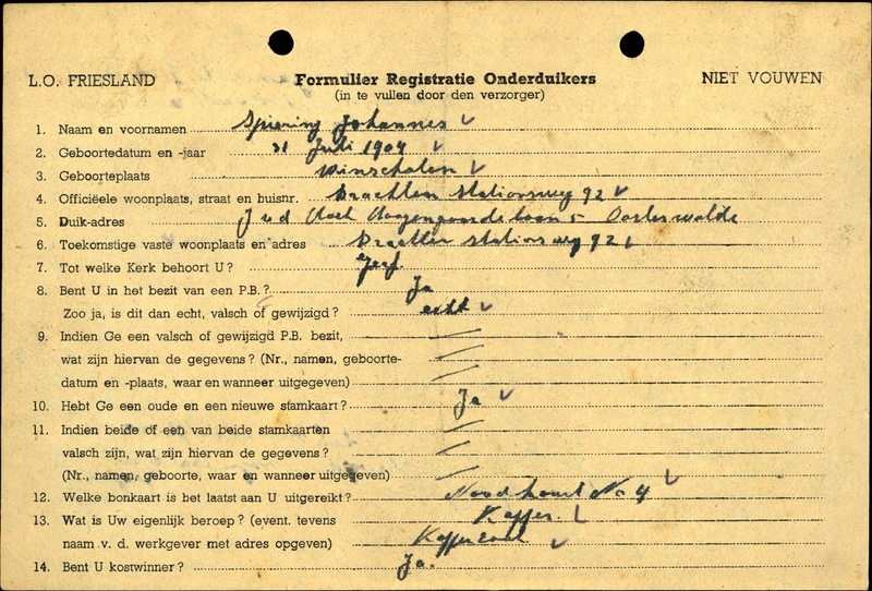 Duikadres: Hoogengaardelaan 5, Oosterwolde - Oorspronkelijk adres: Stationsweg 92, Drachten - Reden onderduik: krijgsgevangene - Overige opmerkingen: Bijzondere opmerkingen: Bijzondere opmerkingen: ik heb onmiddelijk na de bevrijding mijn zaak weer geopend. Hij kreeg f 100,-- steun per maand van de orgenisatie.