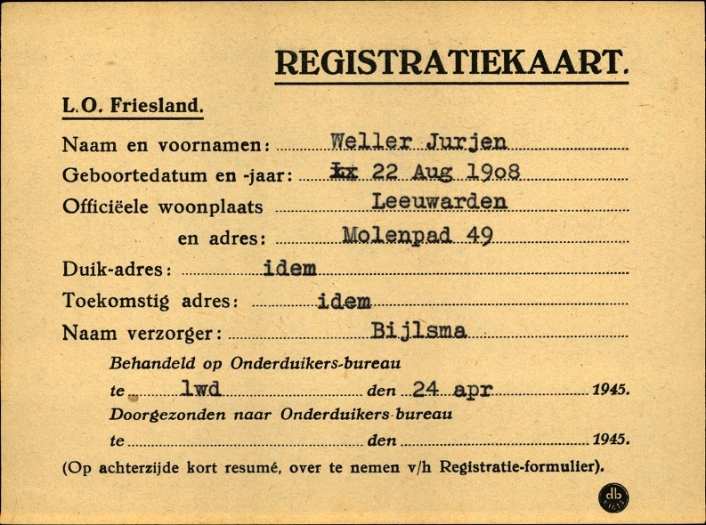 Duikadres: Molenpad 49, Leeuwarden - Oorspronkelijk adres: Molenpad 49, Leeuwarden - Reden onderduik: arbeidsinzet - Overige opmerkingen: Achterkant beroep: Zelfstandig koopman