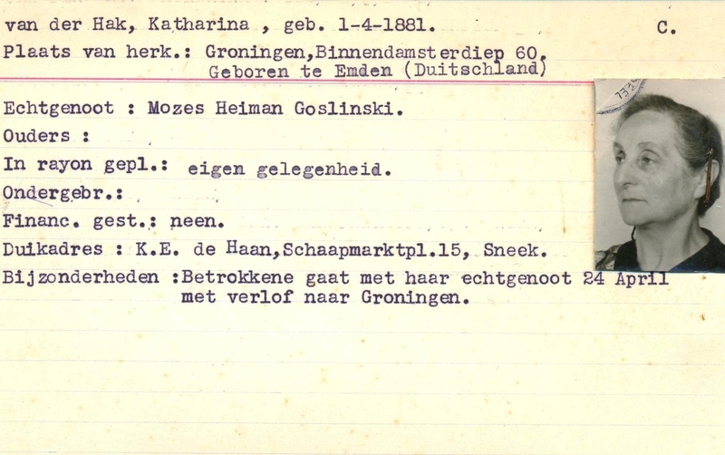Duikadres: Schaapmarktplein 15, Sneek - Oorspronkelijk adres: Binnendamsterdiep 60, Groningen - Overige opmerkingen: Bijzonderheden: In rayon geplaatst: Op eigen gelegenheid - - Betrokkene gaat met haar echtgenoot 24 april met verlof naar Groningen