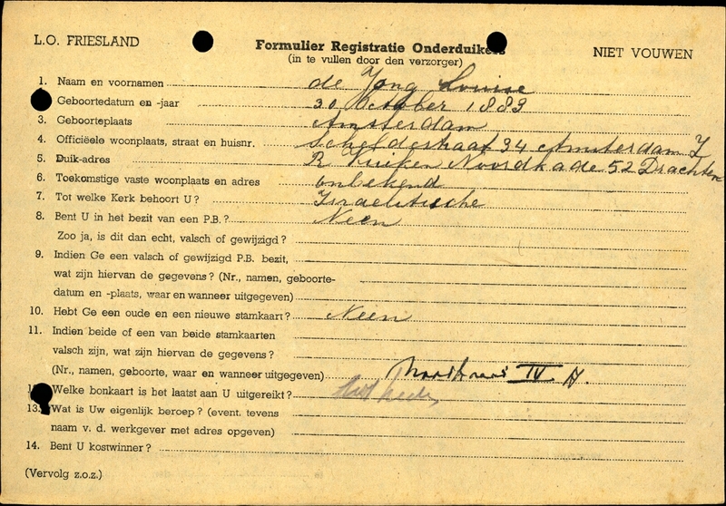 Duikadres: Noordkade 52, Drachten - Oorspronkelijk adres: Scheldestraat 34, Amsterdam-Zuid - Reden onderduik: jodenvervolging