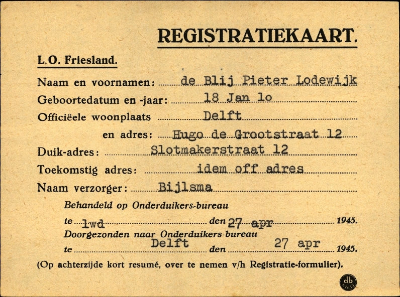 Onderduikinschrijving van Pieter Lodewijk de Blij