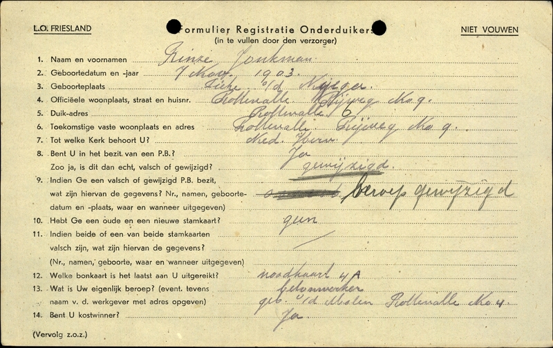 Onderduikinschrijving van Rinze Jonkman