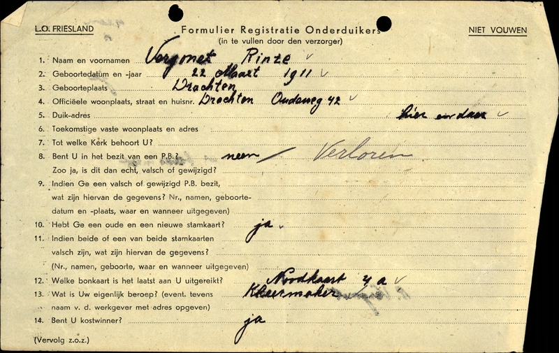 - Oorspronkelijk adres: Oudeweg 42, Drachten - Reden onderduik: arbeidsinzet - Overige opmerkingen: Bijzondere opmerkingen: Duikadres: hier en daar - - Bezit van een P.B.: neen, "verloren" later toegevoegd. - Hebt Ge een oude en een nieuwe stamkaart?: ja - WElke bonkaart is het laatst aan U uitgereikt?: Noodkaart 4a - Bent u kostwinner: ja - Kunt u onmiddelijk in uw oude betrekking terugkeeren?: ja