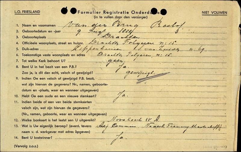 Duikadres: 69, Lippenhuizen - Oorspronkelijk adres: Folgeren 15, Drachten - Reden onderduik: staking