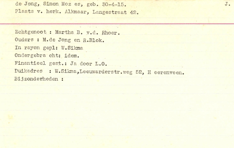 Duikadres: Leeuwarderstraatweg 52, Heerenveen - Oorspronkelijk adres: Langestraat 42, Alkmaar - Overige opmerkingen: Bijzonderheden: financieel gesteund door L.O.